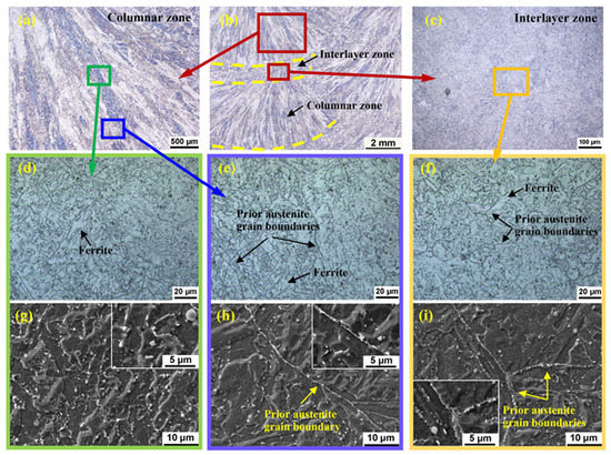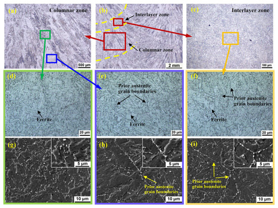 Microstructure of the turbine part WM: (b) the entire microstructure of the WM; (a) the columnar zone; (d,g) the upper part of columnar zone; (e,h) the lower part of columnar zone; (c,f,i) the interlayer zone.
