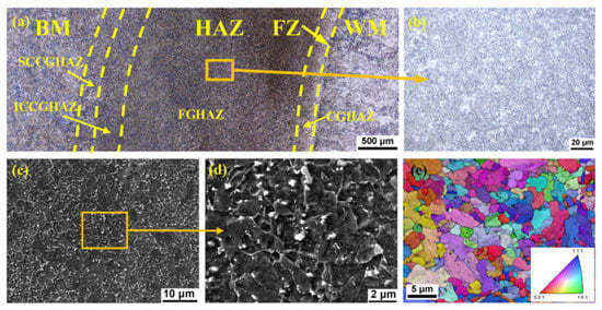 Microstructure of the compressor part HAZ: (a) the entire microstructure of the HAZ; (b–d) the microstructure of FGHAZ; (e) the inverse pole figure of EBSD in the FGHAZ.