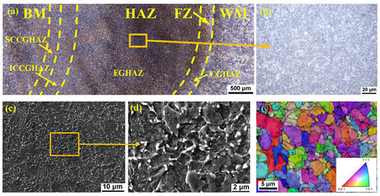 Figure 4 and Figure 5 show the microstructure of the HAZs in the turbine part and the compressor part, respectively. The HAZs, with a width of about 3 mm, consist of coarse-grained HAZ (CGHAZ), fine-grained HAZ (FGHAZ), intercritically reheated coarse-grained HAZ (ICCGHAZ), and subcritically reheated coarse-grained HAZ (SCCGHAZ) [20]. As shown in Figure 4 and Figure 5, the microstructure in the HAZs was mainly fine grains and the area proportion of the FGHAZ was the largest. This was due to the complicated thermal cycles of multi-layer and multi-pass welding. Figure 4b–e show the microstructure details of the FGHAZ in turbine part HAZ. As shown in Figure 4b–d, the microstructure was fine grains and was mainly bainite. Because the sizes of fine grains were difficult to determine by OM and SEM, EBSD was employed to analyze grain sizes. As shown in Figure 4e, the sizes of grain in the FGHAZ were about 3–7 μm. Figure 5b–e show the microstructure details of the FGHAZ in the compressor part HAZ. The microstructure types and grain sizes in the compressor part HAZ were similar to those in the turbine part HAZ.