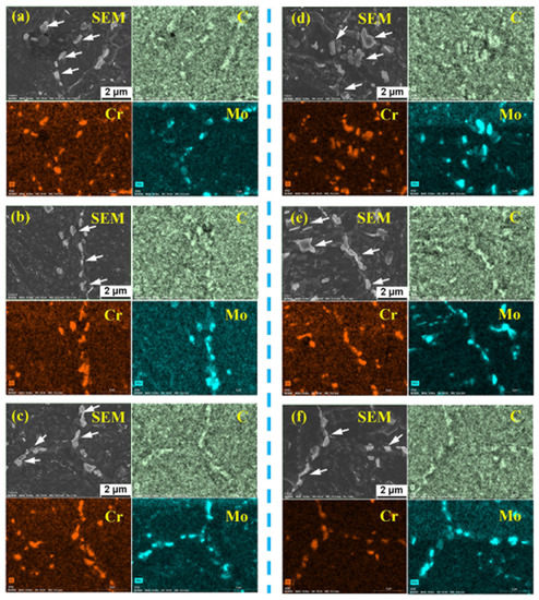 Figure 6a,d show carbides in the upper part of columnar zones in the turbine part WM and the compressor part WM, respectively. Carbides in these zones were mainly distributed in matrix, since there were little PAG boundaries. The sizes and the composition of carbides were similar, which were both hundreds of microns and rich in Cr and Mo. Figure 6b,e show that the carbides in the lower part of columnar zones were also similar. The carbides were mainly distributed along the PAG boundaries and rich in Cr and Mo. Figure 6c,f show that characteristics of carbides in the interlayer zone were similar to carbides in the lower part of columnar zone. Figure 7 show that carbides in the FGHAZs of turbine part and compressor part were also similar, which were both mainly distributed in matrix and rich in Cr and Mo. Therefore, compared with the compressor part WM and HAZ, no noticeable changes occurred in the microstructure of the turbine part WM and HAZ. Therefore, there was no obvious microstructure degradation in the turbine part WM and HAZ during serving at 500–540 °C for 14 years.