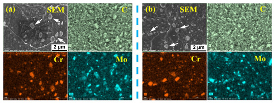In addition, Figure 2, Figure 3, Figure 4 and Figure 5 show that both grain interiors and boundaries of the WMs and HAZs contain many carbides, and carbides at grain boundaries had a higher density and a larger size. To further compare the carbides between the turbine part and the compressor part, high-resolution EDX was used. Figure 6 and Figure 7 show the element distribution maps of the WMs and HAZs, respectively.