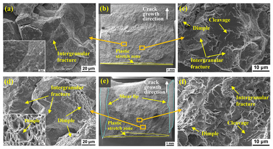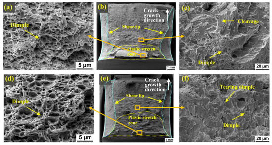 Figure 9 shows the impact fracture morphology of the HAZs. As shown in Figure 9a–c, the fracture morphology of the turbine part HAZ was mainly dimples, as well as a little cleavage, suggesting that the dominant fracture mode was ductile fracture. As shown in Figure 9d–f, the fracture mode of the compressor part HAZ was ductile fracture, with lots of dimples. The plastic stretch zone and shear lip of the HAZs were large. Therefore, the impact toughness of the turbine part HAZ and the compressor part HAZ was high, and the latter was higher than the former. In addition, no intergranular morphology was found, indicating that the grain boundary cohesive strength was still higher than the cleavage strength and yield strength of the grains [18].
