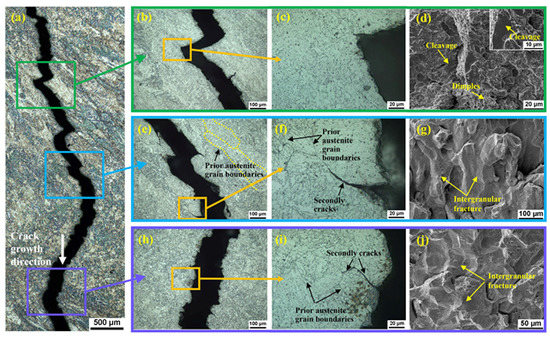 The crack growth path and the fracture morphology of the impact specimen in the turbine part WM: (a) the crack growth path; (b–d) the upper part of columnar zone; (e–g) the lower part of columnar zone; (h–j) the interlayer zone.