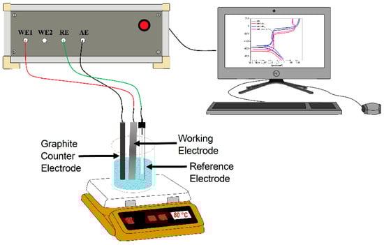 Potentiodynamic polarization curves and electrochemical impedance spectroscopy (EIS) techniques were used. For this, a standard electrochemical glass cell with three electrodes was used. A silver/silver chloride (Ag/AgCl) electrode was used as the reference electrode, whereas a 6 mm-diameter graphite rod was used as the auxiliary electrode. Before starting the tests, the open circuit potential value (OCP) was allowed to stabilize and was monitored during one hour. Once the OCP value was stable, scanning started for the polarization curves, starting at a potential value 600 mV more negative than the free corrosion potential, Ecorr, and scanned into the anodic direction at a sweep rate of 0.1667 mV/s, ending at a potential value 600 mV more anodic than Ecorr. Corrosion current density values, Icorr, were calculated with the aid of the Tafel extrapolation method. Finally, EIS experiments were carried out at the Ecorr and by applying a sinusoidal peak-to-peak signal of 10 mV at frequency intervals of 0.1–100 kHz, with the aid of a potentiostat from ACM Instruments. Selected corroded specimens were analyzed in a low vacuum LEO 1450VP scanning electronic microscope. A schematic diagram of the experimental set-up is shown in Figure 1.