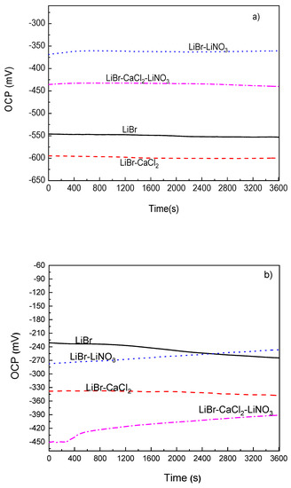 The variation of the OCP value with time for 1018 carbon steel as well as for type 304 and 316L stainless steels in the LiBr/H2O mixture with the addition of CaCl2 and/or LiNO3 at 80 °C can be seen in Figure 2. This figure shows that the addition of CaCl2 to LiBr/H2O caused a shift of the OCP value for 1018 carbon steel towards more active values as compared to the value obtained in LiBr/H2O, as shown in Figure 2a, since for the latter, the OCP value was close to −550 mV, whereas for the former, it was between −640 and −610 mV. Most reported results show that carbon and stainless steels exhibit high corrosion rates when exposed to CaCl2 solutions. For instance, in [29,30], it is reported that an increase in the testing temperature from 30 to 80 °C brought an increase in the corrosion current density value during the first hours of testing, but after that time, a layer of corrosion products formed on top of the steel, determining a decrease in the corrosion current density value. Similar results were reported in [31] for the working pair consisting of LiBr/H2O+CaCl2. On the other hand, the addition of LiNO3 shifted the OCP value into the noble direction, whereas that of CaCl2+LiNO3 shifted it towards more active values, which as reported in a high number of research works, lead to the formation of passive layers on top of carbon and stainless steels [36,37,38,39].