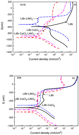 For type 304 and 316L stainless steels (Figure 2b,c), the OCP values were, generally speaking, nobler than those obtained for 1018 carbon steel. Thus, the OCP value in the LiBr/H2O mixture was close to −550 mV for 1018 carbon steel; for 304 stainless steel, it started at a value close to −235 mV and finished at a potential value of −265 mV, while for 316L steel, it started at a value of −110 mV and finished at a potential value of −135 mV. According to this, the lowest susceptibility towards corrosion in this environment was observed for 316L steel. Similarly, for both stainless steels, the addition of CaCl2 and/or LiNO3 to the LiBr/H2O mixture made the OCP value to shift towards more active values. One exception was observed with the addition of LiNO3, which at the beginning of the test, shifted the OCP values towards slightly more active values, but after 2400 s of exposure, caused the OCP value to become either equal to or slightly nobler than those obtained in the LiBr/H2O mixture. One very important feature to note is that for the three steels, the OCP values remained very constant as time elapsed, regardless of the addition of CaCl2 and/or LiNO3, even in the LiBr/H2O mixture, which indicated the stability of the corrosion products layer on top of the steels.