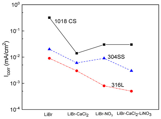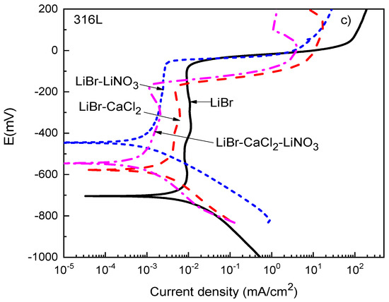 For type 304 and 316L stainless steels (Figure 3b,c), the polarization curves in the LiBr/H2O mixture exhibited a passive zone which was wider for the latter, since for 304 steel, it started at a potential value close to −400 mV and ended at a pitting potential value around −150 mV, i.e., it was 250 mV wide, whereas for 316L steel, it started at a potential value of −650 mV and ended at a pitting potential value of −50 mV, i.e., it was 700 mV wide. It has been very well documented that bromide can induce pitting corrosion on stainless steels due to its ability to breakdown passive films [44,45]. In addition to this, the corrosion and passive current density values were higher for type 304 than for type 316L stainless steels. The passive film formed on type 304 stainless steel had a dual structure, with an inner chromium oxide/hydroxide layer and an outer layer of iron oxide/hydroxide [45]. The higher Mo amount contained in type 316L stainless steel led to the formation of a more stable passive film on the latter because of the incorporation of molybdenum oxide into the chromium oxide film [43,44]. It was established above that the pitting potential for 304 steel was −150 mV, whereas that for 316L stainless steel was −50 mV. Both the corrosion and the passive current density values were lowered with the addition of CaCl2 and/or LiNO3. The lowest passive current density for type 304 steel was obtained when either CaCl2 alone or in combination with LiNO3 was added, whereas for 316L steel, this value was obtained with the addition of LiNO3 either alone or in combination with CaCl2. In both steels, a reduction of the passive current density value by nearly one order of magnitude was obtained.