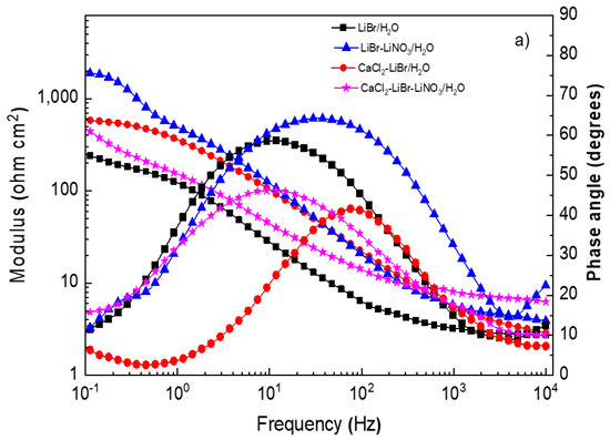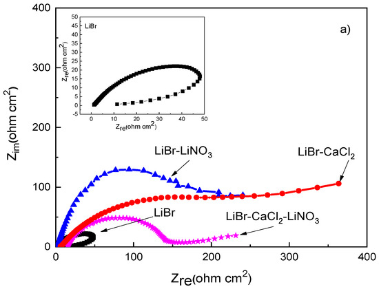 The Nyquist diagram for 1018 carbon steel, Figure 5a, shows the presence of a depressed, capacitive semicircle at high and medium values of frequency, whereas at the lowest frequencies, an inductive loop is present in the LiBr/H2O system only, probably due to the adsorption/desorption of some intermediate species such as FeOH+ in Equation (4), whose adsorption and desorption control the corrosion reaction. The semicircle shape changed, and thus, the corrosion mechanism, with the addition of either CaCl2 and/or LiNO3 to the LiBr/H2O system, since the inductive semicircle disappeared, and, in addition to the observed capacitive loop at high and intermediate values of frequency, a second capacitive loop was observed at the lowest frequency values for 1018 carbon steel; in contrast, for both stainless steels, a single capacitive loop was observed at all frequency values. The semicircle observed at high and intermediate frequency values was attributed to the electrochemical reactions taking place at the metal/double electrochemical layer interface, whereas the lowest frequency semicircle was related to the electrochemical reactions taking place at the metal/corrosion products film interface. The high frequency semicircle diameter was the smallest in the LiBr/H2O mixture, whereas it increased when CaCl2 and/or LiNO3 were added, reaching the highest value when CaCl2 was added.