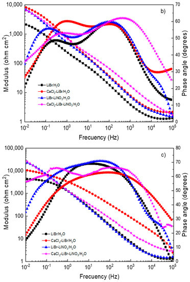 EIS data provide information on the involved corrosion mechanism. Nyquist diagrams for different steels in the LiBr/H2O mixture with the addition of CaCl2 and LiNO3 are presented in Figure 5, whereas the corresponding Bode plots are shown in Figure 6.