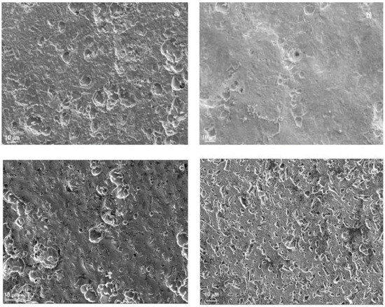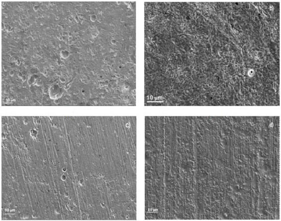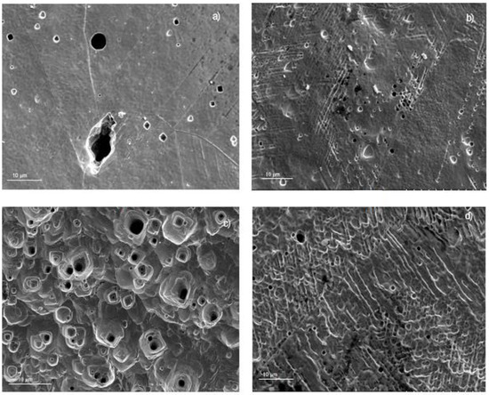Surface samples of 1018 carbon steel corroded in LiBr/H2O containing CaCl2 and/or LiNO3 are shown in Figure 6. For specimens corroded in the LiBr/H2O system (Figure 7a), the aggressiveness of the solution produced a very rough steel surface, showing some uniform type of corrosion in combination with an apparently localized, shallow corrosion, similar to pits. The polarization curve in this condition did not show the presence of a passive film; therefore, no pitting type of corrosion was expected. On the other hand, specimens corroded in the presence of CaCl2 (Figure 7b) showed a very smooth surface, indicating that the damage produced by the environment was very low, in combination with some pits. Specimens corroded in LiBr/H2O+LiNO3 (Figure 7c), showed a smooth surface in combination with a type of localized corrosion, since in this condition, the polarization curve showed evidence of a very stable passive film, very similar to that exhibited by the specimens corroded in the presence of CaCl2 (Figure 7b), where the pitting type of corrosion was expected. Finally, the surface morphology of specimens corroded in LiBr/H2O+CaCl2+LiNO3 (Figure 7d) exhibited a combination of localized and uniform corrosion, which, according to the polarization curve (Figure 3a), indicated a not very stable passive film, because the passive current density did not remain constant with the applied potential. On the other hand, 304 type stainless steel corroded in LiBr/H2O (Figure 8a), showed the presence of pits, some of which with a diameter larger than 10 μm, whereas there was no evidence of a general type of uniform corrosion, since the steel surface looked very smooth, a signal that the steel was not corroded by the electrolyte. The polarization curve under all conditions tested showed the presence of a passive layer, and, thus, a great susceptibility towards the pitting type of corrosion, as shown in Figure 3a. When the steel was corroded in LiBr/H2O+CaCl2 (Figure 8b), the number and size of the pits decreased, and the surface looked rougher, evidence that the addition of CaCl2 increased the solution aggressiveness. On the other side, for the test in LiBr/H2O+LiNO3 (Figure 8c), the number of pits and their size increased considerably, indicating a greater susceptibility towards the pitting type of corrosion, whereas for the steel corroded in LiBr/H2O+CaCl2+LiNO3 (Figure 8d), the number of pits present on the metal surface was high but smaller than that found in the test carried out in LiBr/H2O+LiNO3. The steel surface showed a high roughness due to the solution aggressiveness.