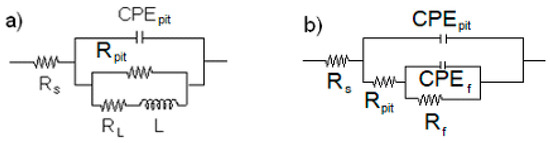 As it can be seen in micrographs in Figure 7, Figure 8 and Figure 9, the main involved of corrosion in all cases was pitting corrosion; therefore, we must take this into account when using equivalent electric circuits for EIS data fitting. Figure 10 shows the equivalent electric used to fit the EIS data of the tested steels. In this figure, Rs represents the electrolyte or solution resistance, Rpit is the resistance inside the pit, CPEpit is the constant phase element which replaces the ideal capacitance of the pit [45], Rf is the resistance of the corrosion products film, CPEf is the constant phase element which replaces its ideal capacitance, L is the inductance, and RL is its resistance.
