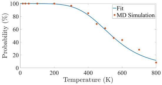 Following the model in Section 3.2, we can express the and according to the activation parameters in one of the nucleation sites only (without loss of generality, we choose here the site with the acute angle, numbered as 1). However, the information from the second nucleation site is embedded within the function , which is also unknown for every strain and temperature. Thus, let us first estimate the function and its derivatives at the most probable strain . Looking at the definition of in Equation (4), we can interpret the value of as the probability to nucleate a dislocation at the acute angle at a temperature . This value was obtained directly from the MD simulation (see Figure 3), and accordingly . We emphasize that when the probability to nucleate in the obtuse angle is small, as expected at low temperature, the statistics obtains from 30 or 60 simulations might not be sufficient to calculate accurately Since there is a probability to nucleate a dislocation in obtuse angles at all non-zero temperatures, even if extremely low, we fitted a function , where the best fit was achieved with and . The fit is shown in Figure 3. Although this is a fundamental fit, that is aimed at facilitating the analysis, it stems from the fact that nucleation occurs only from the acute angle at , and as the temperature is increased, the probability to nucleate dislocation from the acute angle decreases but do not vanish.
