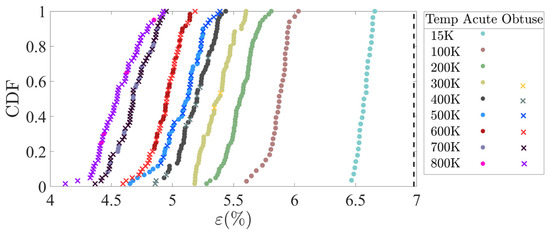 CDFs nucleate a dislocation as a function of the strain for different temperatures. The critical strain of the acute angle is marked in a dashed line.