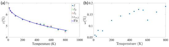 While the values of and are known from the MD simulations, to find the derivatives and using Equations (12) and (14), the first derivative of should be calculated. Since is a function of both strain and temperature, its partial derivative satisfies