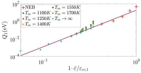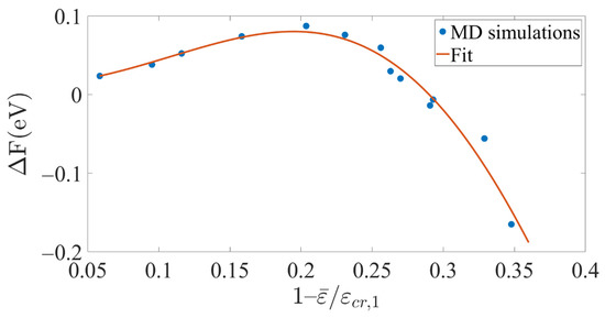 where is the upper gamma function. Then, we calculated the PDF as a function of the temperature and the strain using a numerical derivative of the CDF, for each set of , and , from which we found the most probable nucleation strain as a function of the temperature. A value of was found to yield the best comparison between the calculated values of using Equation (6) and the MD simulation results. The corresponding parameters of the activation energy are and . The fitted result of the energy barrier for nucleation from the obtuse site is shown in Figure 9.