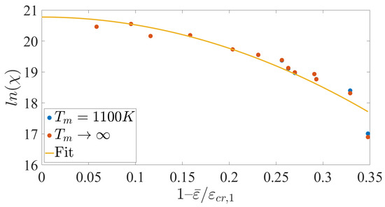At , a dislocation will nucleate only if the spontaneous strain for nucleation is reached, i.e., , which occurs only if the free-energy barrier vanishes = 0, regardless of the value of . Thus, according to Equation (21), the value at which the curve crosses the axis corresponds to . Indeed, the difference in the plots for different values of in Figure 7 diminishes for small values of (). Since the values of at the lower temperatures are weakly affected by the choice of we found to be equal to by extrapolating the results for , using a relation of the form . An example for the fitted relation found for is shown in Figure 7. The range of values found for is slightly lower than values found for dislocation nucleation in other systems [31].
