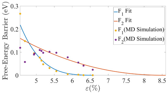 Since we can neglect the activation entropy, is a function of the strain only, i.e., . Accordingly, the values plotted in Figure 9 for as a function of are also the values of the free-energy barrier. Therefore, we can fit a function for the results, to find the dependence of the free-energy barrier on the strain. In previous studies, a power law was argued to fit the activation energy near the spontaneous nucleation threshold. Thus, we fit a function of the form