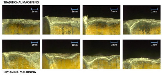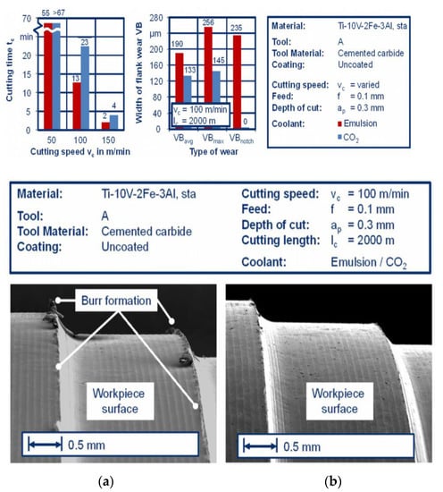 Tool wear and burr formation during the cryogenic machining of Ti-10V-2Fe-3Al. (a) Emulsion; (b) CO2. Reprinted with permission from reference [35], Copyright 2011 Elsevier.