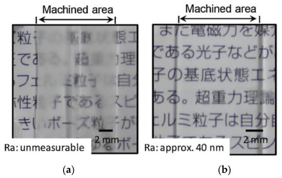 In addition to the research of Aldwell and colleagues, Kakinuma et al. published an article employing the micro-end milling of cryogenically cooled PDMS [41]. The authors utilised a complete emersion strategy wherein the both the (single crystal diamond) milling cutter and PDMS workpiece were submerged in a vat of liquid nitrogen; thereafter, a ductile mode milling strategy was employed with a varying depth of cut. By employing such a strategy, the PDMS workpiece is held below the glass transition temperature such that it retains properties of low adhesion and elasticity. In abstract, this allows the thermal deformation (which is implicit during a machining operation) to be suppressed, and thus form inaccuracies to be minimised. When machining trials were conducted, the authors observed that the large quantity of heat generated in the cutting operation was sufficient to vaporise the proximal LN2 and, subsequently, that the generated surface transparency was unsatisfactory. In response to this realisation, Kakinuma and colleagues went on to additionally apply cryogen directly to the cutting zone by way of LN2 jet. In doing so, heat flux into the workpiece was minimised, and subsequently a high-quality surface with lower opacity and surface roughness was generated (Figure 4). Given this success, the authors went on to machine a series of microfluidic chips with the outlined approach, noting benefits over micromolding processes such as a comparative ease in forming stepped channels and a generally far reduced lead time.