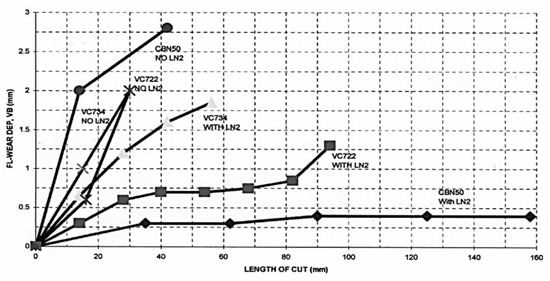 In addition to the trials conducted on RBSN and Ti-6Al-4V the author also considered the cryogenic machinability of Inconel 718 and Tantalum (with a H13A tool), again observing a markedly reduced rate of tool wear when LN2 cooling was employed (in lieu of dry machining). Despite this clear trend, it is difficult to accurately extrapolate tool life from the figures present in the report. In the case of Tantalum, at the points where the tools were equivalently worn, the magnitude of flank wear was extremely low, which of course raises questions as to the efficacy of any conclusions which are drawn. With this limitation in mind, it was nonetheless observed that the LN2-cooled tool required an approximately 90 mm cutting length to reach a flank wear of approximately 0.15 mm, whilst the uncooled tool reached such a wear state after only 20 mm (with LN2 cooling). Unfortunately, however, when Inconel 718 is considered, the scope to predict the impact of cutting fluid on tool life is further hampered, wherein the available data are not at any point coincident and thus insufficient to make a sober estimate.