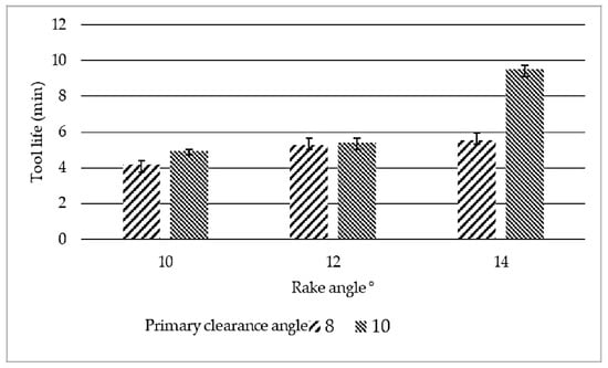 Given this focus, one such article that considers the problem of tool design was recently published by Shokrani and Newman [46]. As part of their research, the authors focused upon the relationship between cutting insert geometry and tool life in the context of the cryogenic end milling of Ti-6Al-4V. Specifically, Shokrani and Newman mapped the relationship between both the rake and primary clearance angle on tool life, tool wear and surface roughness. The authors utilised 12 mm diameter solid WC end mills coated with TiSN-TiN to a thickness of approximately 3 µm. They employed a constant LN2 nozzle position and flow rate (20 kg/h) throughout the trials. Within this experimental design, Shokrani and Newman noted the positive implications of both primary clearance angle and rake angle (Figure 7) on tool life. Moreover, they observed that, although the impact of increased clearance angle persisted across each rake angle, the effect was most pronounced at the highest rake angle, and likewise, the correlation between rake angle and tool life was most exaggerated at the higher clearance angle. Although these observations are of clear value, the authors do however note that (despite not being manifested in their trial) excessively increasing either rake, or clearance angle, can lead to weakening of the cutting edge and ultimately premature tool failure.