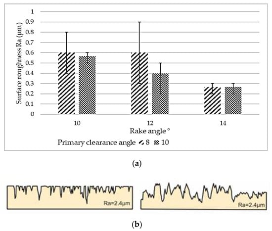 In addition to the tool life implications of manipulating clearance and rake angle, the relationship between surface roughness and insert geometry was also considered. In order to realise these goals Shokrani and Newman took readings at the start of experimentation in order to remove the impact of tool wear on average surface roughness (Ra). In doing so, the authors again noted the positive implications of both increased primary clearance and rake angles such that a tool with a sharper cutting edge corresponded to an equivalent or reduced surface roughness across the entirety of the data set (Figure 8a). Whilst it is difficult to qualitatively assess the relative effect of rake and primary clearance angle on this phenomenon, it is true that the lowest surface roughness was generated at a rake angle of 14° regardless of the primary clearance angle. Given this observation, it is also apparent that the impact of primary clearance angle is most significant at a rake angle of 12°. Whilst these observations make a compelling case for the use of steeper rake and clearance angles, it is important to note that the true impact of cutting edge geometry (on the surface mechanics of the machined workpiece) is not fully captured via Ra measurement. Rather, it is often true that two surfaces with an equivalent centre line average will exhibit varying degrees of asperity, and thus vastly different tribological performance [47] (Figure 8b).