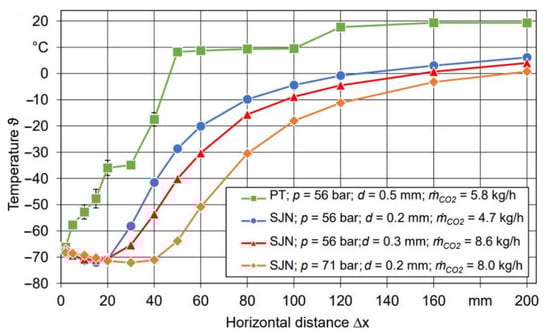 Another paper that considers nozzle design and optimization for cryogenic machining was published by Gross et al. [50], who employed a similar nozzle optimization focus to the earlier work of Pereira and colleagues. In their research Gross and colleagues undertook preliminary CO2 + MQL nozzle optimization testing followed by cryogenic CNC milling trials on Ti-6Al-4V. In their preliminary testing, the authors first measured the temperature in the CO2 jet stream over a range of distances with four nozzle diameters: 0.5, 0.3 and 0.2 mm. In order to realise this goal, the authors utilised a type K thermocouple, which was vertically fixtured to coincide with the mid-stream of the CO2 jet. As part of their research, the authors trialled both smooth jet nozzles (SJN) and plastic tube nozzles (PT), wherein a CO2 pressure of 56 bar was generally employed, other than in one ancillary trial wherein a higher pressure of 71 bar was chosen. In addition to the temperature profiles developed as part of this research, Gross and colleagues also later went on to test the relative spread of their MQL by placing blotting paper in front of the MQL jet and qualitatively analysing the profile made by the lubricant. The experimental set-up employed in their research is outlined in Figure 10.