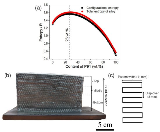 (a) Configurational and total entropy calculated for the mixed compositions of P91 steel and 740H superalloy showing a maximum at 26 wt.% P91, (b) 26 wt.% P91 build and (c) the printing pattern used for each layer during fabrication of the build using WAAM.