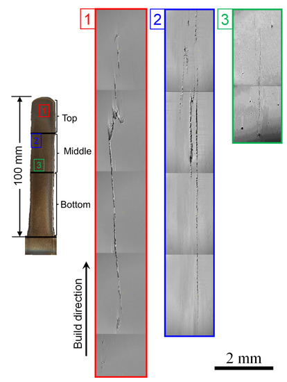 The build (Figure 1b) fabricated using the WAAM technique was sectioned along the XZ plane (X is the scan direction and Z is the build direction) with electric discharge machining (EDM, Mitsubishi MV2400S, Mitsubishi Electric Corporation, Tokyo, Japan). This slice of sample was used for further location-specific analysis, and the sample was partitioned as top, middle and bottom, as indicated in Figure 1b, for ease of identification. The sample was ground from 800 to 1200 grit SiC emery papers and further polished using diamond (3 and 1 μm particle size) and colloidal silica (0.04 μm particle size) suspensions to obtain a scratch-free surface with a mirror finish. The cracks at different locations along the build direction were viewed in the as-polished surface using a ZEISS Sigma 500 VP scanning electron microscope (SEM, Carl ZEISS, Dresden, Germany) in both secondary electron (SE) and backscattered electron (BSE) modes. The composition maps were determined using Oxford Aztec energy dispersive spectroscope (EDS, Oxford Instruments, Abingdon, UK) attached to the SEM. To determine the nature of the cracks, electron backscattered diffraction (EBSD) was carried out using FEI Scios Dual Beam focused ion beam (FIB)–SEM equipped with the EDAX Hickory EBSD system and analyzed using TSL-OIM software version 8.