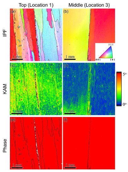 (a,b) IPF, (c,d) KAM and (e,f) phase maps from Locations 1 and 3 (shown in Figure 2) from the top and middle sections, respectively, showing that the cracks are intergranular with high KAM around the crack.