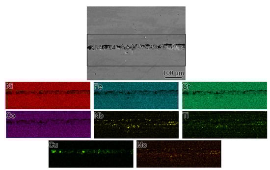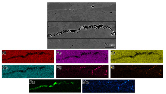 BSE-SEM micrograph along a crack from the middle portion (Location 2 in Figure 2) of the sample and their corresponding composition maps for major (Fe, Ni, Co, Cr) and minor (Nb, Ti, Mo, Cu) alloying elements.