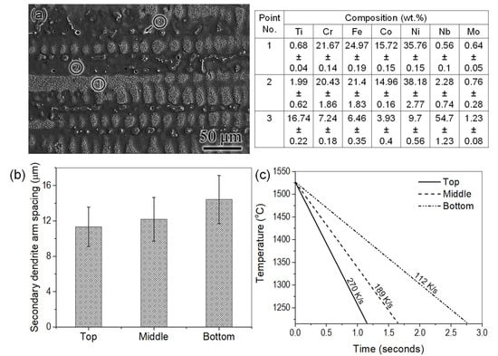The SDAS was determined from the etched microstructure of the sample, as shown in Figure 6a. The compositions determined using EDS from different regions are listed in the table embedded in Figure 6. It can be observed that the concentration of Nb varies significantly in different locations. Nb enrichment can be observed in the interdendritic region (Point 2 in Figure 6a), in comparison with the dendrites (Point 1 in Figure 6a), including the primary and secondary ones. However, the white precipitates found in the interdendritic region had a higher Nb content, along with Ti and Mo. These precipitates corresponded to the Laves phase (Point 3 in Figure 6a). Due to the increased enrichment of Nb towards the end of solidification, the Laves phase was expected to form in the interdendritic region. Moreover, the Laves phase was found to be one of the solidifying phases towards the end of solidification, from the Scheil solidification curve obtained for the nominal composition of 26 wt.% P91 listed in Table 1. The SDAS, calculated using the etched micrographs, and the cooling rate calculated using Equation (2) are shown in Figure 6b,c, respectively. An inverse correlation was observed between the SDAS and the cooling rate. It is to be noted that although a constant interpass temperature (175 °C) was maintained during the deposition of each layer to control the bulk cooling rate, the local cooling rate was found to vary considerably leading to variation in microstructural features along the build direction. The estimated cooling rate and SDAS were used as inputs for the DICTRA simulation.