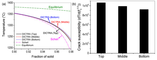 The temperature vs. solid fraction curves, obtained using DICTRA simulation for different locations shown in Figure 7a, were compared with the prediction using the Scheil modeling and equilibrium calculations for the alloy containing 26 wt.% P91, with the composition listed in Table 1. The solidus temperature varied significantly as the calculation method varied, mainly because of the difference in cooling rate assumed for different calculations. The cooling rate assumed in the equilibrium calculation was the least, with complete diffusion in both solid and liquid during solidification, due to which the solidus temperature was the highest amongst the different calculation methods. On the other hand, the Scheil model showed the lowest solidus temperature since it assumed a faster cooling rate with complete diffusion in the liquid and negligible diffusion in the solid. The solidus temperatures calculated using the one-dimensional DICTRA simulations were in between the equilibrium and Scheil calculations, since the cooling rate was intermediate. Moreover, it could be seen that the solidus temperature increased from the top to bottom sections, as the cooling rate increased. The solidification cracking susceptibility was taken as the maximum in the slope of the temperature vs. fraction of solid curve () obtained using the DICTRA simulations, as per the Kou criterion from various sample locations as shown in Figure 7b. The cracking susceptibility was the highest in the top portion of the sample with the highest cooling rate. Solidification cracking susceptibility decreased as the cooling rate decreased in the middle and bottom portions. The calculated solidification cracking susceptibility also correlated well with the cracking behavior characterized from different sample portions (Figure 2).