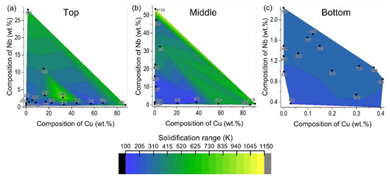 From the above-mentioned results, it is evident that the solidification cracking susceptibility is highly location-specific for the 26 wt.% P91 sample fabricated using WAAM. It is also clear that the cooling rate plays a major role in inducing the location-specific cracking behavior, since the top portion with the highest cooling rate had the longest crack. In addition, a difference in the extent of segregation of minor alloying elements such as Nb and Cu was also observed in different portions of the sample. However, the role of segregation on the solidification behavior needs to be probed further to identify their role in the location-specific cracking behavior. Therefore, the composition from several points within and around the cracks was measured using EDS from different sample locations and used as input for Scheil simulations. The solidification range calculated for each point from different locations are shown in Figure 8. From these EDS measurements it was observed that there was a varying degree of enrichment of Nb and Cu, compared to the nominal composition of these elements for the 26 wt.% P91 graded alloy, as listed in Table 1. In comparison with the top and middle part, the bottom region had the lowest enrichment of Nb (nearly 2.5 wt.%) and Cu (~0.4 wt.%), along with a lower solidification range, i.e., the temperature difference between liquidus and solidus. However, in the top and middle regions, the enrichment of Cu and Nb rose rapidly. The composition of Cu was found to be up to 87 wt.% in both the regions, while the extent of enrichment of Nb was lesser in the top region (~27 wt.%) in comparison with the middle region (~56 wt.%), which correlated well with the composition maps for Nb from these regions. Moreover, it was observed that the enrichment of Nb and Cu was likely to increase the solidification range. The increase in solidification range due to the increase in Nb content was more pronounced than the segregation of Cu. As the Nb content reached close to 60 wt.%, the solidification range was as high as 1133 K; as the Cu content became higher, the solidification range was up to 681 K. It is to be noted that the effect of other minor alloying elements, such as Mo and Ti, also played a role, although they were not as noticeable as Nb. For instance, in the top region, a wide solidification range (848 K) was observed at a point where the Cu content was intermediate (~30 wt.%) in comparison with the maximum enrichment, while the Nb and Mo content was almost equal (~2.5 wt.%). It was also observed that Mo affects the solidification range significantly if it is equal to the composition of Nb along with higher Cu content. This proves that the effect of Mo is not as significant as Nb in affecting the solidification range.