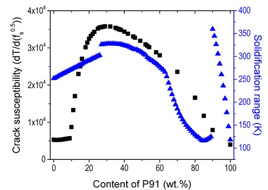 To mitigate location-specific solidification cracking in fabricating graded alloys from P91 to Inconel 740H using WAAM, the following solutions are suggested to obtain a crack-free build. Solidification characteristics such as the solidification range as well as the overall solidification cracking susceptibility should be considered as the primary factors when evaluating printability. Although alloy entropy may help to stabilize the microstructure, it does not have a direct influence on preventing crack formation, and thus should be considered with other design factors during the interlayer design for joining P91 steel with the 740H superalloy. Figure 9 represents the overall solidification cracking susceptibility using the Kou criterion and the freezing range computed using the outputs from Scheil calculations performed for the mixed compositions between P91 steel and 740H superalloy in steps of 1 wt.%. In this case, the maximum slope was calculated from the temperature vs. fraction of solid curve obtained from Scheil simulation for each alloy composition to apply the Kou criterion. From this plot, evidently, the overall solidification cracking susceptibility is highest around 26 wt.% P91. Moreover, there is an abrupt increase in the freezing range close to that composition. This proves that even though the calculated entropy for 26 wt.% P91 may be the highest, the solidification characteristics of this alloy are not conducive to being fabricated using WAAM. Thus, a careful analysis of the important attributes during solidification, such as freezing range and overall solidification cracking susceptibility, needs to be accounted for during the design of interlayers for joining dissimilar materials using AM. It is to be noted that, although segregation is one of the major factors that affect the cracking behavior, the overall solidification range is also equally important. The segregation behavior along with the freezing range will influence the solidification cracking susceptibility. From Figure 9, it is clearly evident that the freezing range of pure Inconel 740H is much lower than the 26 wt.% P91 graded alloy. It is well known that the smaller the freezing range, the lower will be the solidification cracking susceptibility. Hence, in Inconel 740H, although the Nb segregates and forms the Laves phase in the interdendritic region (as observed from our previous work), the lower freezing range does not allow it to form cracks. Hence, it is clearly evident that a complex interplay between the solidification range and segregation behavior influences the solidification cracking susceptibility.