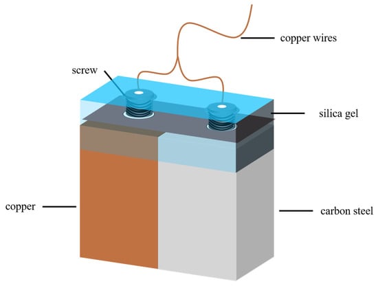 Copper (99.99 wt.%) and carbon steel were used as experimental materials. Samples for weight loss tests were cut into cubes of 20 mm × 10 mm × 5 mm. The chemical compositions of steel are listed in Table 1. All surfaces were polished with 400 grit emery paper, cleaned with deionized water, ultrasonically washed in alcohol and dried in air for 24 h. Thereafter, the specimens were weighed separately with an electronic balance. To ensure the reliability of weight loss, copper wires were welded on a screw on the top of the sample to connect the galvanic couples. The non-working area was sealed with silica gel. The sample is illustrated in Figure 1.