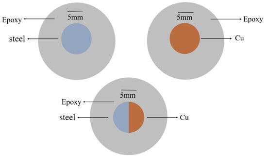 As for electrochemical measurements, the galvanic couple electrode was cut from steel and copper into a 0.5 cm radius semi-circle. The radius of steel and copper electrodes was also 0.5 cm. As Figure 2 shows, all electrodes were sealed with epoxy resin and welded with copper wires on the bottom. The working area of the electrodes was 0.785 cm2. Prepared electrodes were ground with 400–2000 grit emery paper, then polished with alumina paste and washed with deionized water and alcohol.