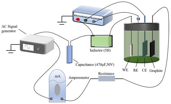 Electrochemical tests were performed with a conventional three-electrode cell including a platinum counter electrode and a saturated calomel electrode (SCE) as reference. The AC intensity was adjusted by a signal generator (AFG-2225, GW INSTEK, Taipei, China) to 0, 10, 30, 50, 100 A/m2. An inductor (5 H) was connected between the working electrode and electrochemical workstation to avoid AC interference in the electrochemical test system. A capacitor (50 V, 470 μF) was used to isolate the DC signal. A schematic diagram of the equipment is shown in Figure 3.