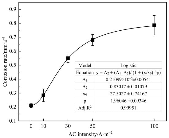 The weight loss results of the steel–copper couple with different AC intensities in red soil are illustrated in Figure 5, which indicates that the corrosion rate of steel in the galvanic couple is 0.21 mm·a−1 without AC interference. There is a positive correlation between the corrosion rate of the galvanic couple and AC. Li et al. [30] researched the corrosion behavior of Q235 steel in Yingtan red soil. They found that the corrosion rate of Q235 steel was nearly 0.1 mm/a. Tang et al. [31] studied the effect of AC current on the corrosion behavior of Q235 steel in acidic soil solution. The result demonstrated that the corrosion rate was nearly 0.2 and 0.25 mm/a when AC density was 50 A/m2 and 100 A/m2. These experimental results demonstrated that the coexistence of AC and galvanic effect accelerated the corrosion of steel. The fitted result demonstrates that the corrosion rate of steel in the galvanic couple calculated by the weight loss data with AC meets the logistic model. The adjusted R2 value of the fitted line is close to 1, which means the precision of the fitted result is high.