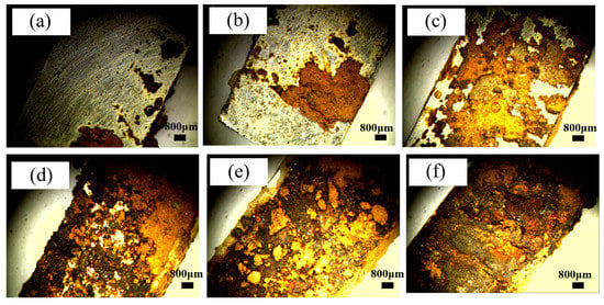 Figure 6 illustrates the corrosion morphology of the steel in the steel–copper couple after the weight loss test. There are fewer surface corrosion products of single steel without AC interference. After coupling with copper and interference with AC, the corrosion products obviously increase with increasing AC intensity. The characterization of corrosion products develops from localized to uniform corrosion. As Figure 6f shows, the corrosion products completely covered the surface; severe uniform corrosion occurs when the AC intensity is 100 A/m2.