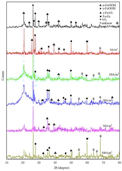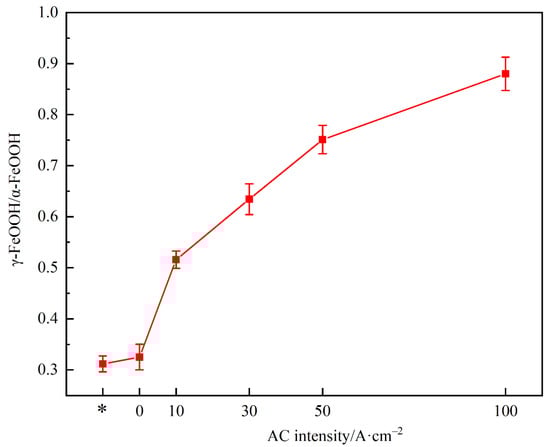 In order to study information about the rust in detail, the corrosion products obtained from steel in the steel–copper couple were subjected to X-ray diffraction. The spectra are illustrated in Figure 7. It is clearly seen that the main rust from steel is γ-FeOOH (JCPDS card no. 18-0639), α-FeOOH (JCPDS card no. 26-0792), γ-Fe2O3 (JCPDS card no. 33-0664) and Fe3O4 (JCPDS card no. 28-0491). SiO2 (JCPDS card no. 47-1144) [32,33,34] was from the soil. It is generally accepted that the corrosion products of steel mainly include α-Fe2O3, Fe3O4, α-FeOOH, β-FeOOH and γ-FeOOH [35,36,37]. The value of γ-FeOOH/α-FeOOH from the main intensity peak ratio of 36°/21° for carbon steel in the steel–copper couple is compared with different AC intensities. As Figure 8 shows, “*” represents the single steel sample without AC interference. The value of γ-FeOOH/α-FeOOH is increased when AC applies to the galvanic couple, which indicates that AC inhibits the transformation of γ-FeOOH to α-FeOOH. Many previous works have studied the formation and transformation mechanism of iron oxide [38,39]. The formation and transformation of iron oxides vary in different environments. γ-FeOOH would transform into α-FeOOH and Fe2O3 with a decrease in pH [40,41].