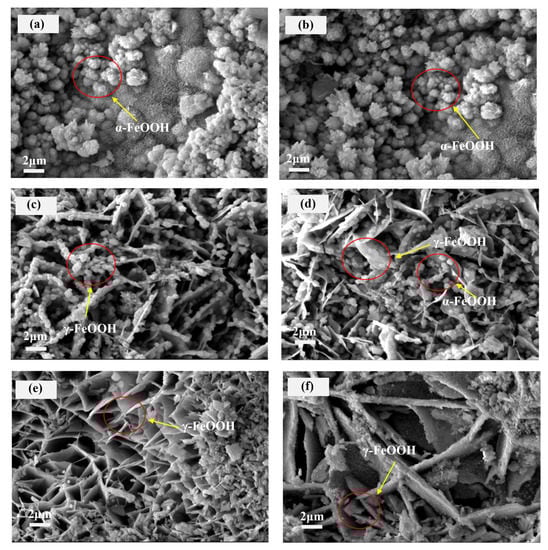 The SEM image of steel in the steel–copper couple after the application of different AC intensities is presented in Figure 9. The shape of the corrosion products is mainly like the cotton ball in Figure 9a,b. Some previous studies [42,43] concluded that α-FeOOH is the small and compact cotton-like structure. There are some needle-like structures around the α-FeOOH which are γ-FeOOH. The structure of α-FeOOH is stable and compact, while γ-FeOOH is porous and loose [44]. The corrosion products mainly appeared as porous plate-like structures when AC interfered with the steel–copper couple, which means the composition of γ-FeOOH is increased with AC interference. A number of plate-like corrosion products are linked together to form a large, dense, porous structure. Such products are multi-hole structures, which led to corrosive ions being able to easily pass through the rust to reach the substrate. This means that rust cannot protect the metal and the corrosion rate is increased [45].