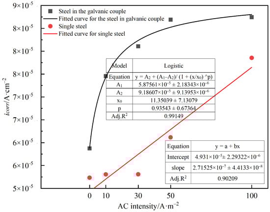 The fitted corrosion current density (icorr) of the steel in the galvanic couple electrode and single steel electrode is shown in Figure 10. The corrosion current density of the specimen increases with the rise of AC interference intensities. The corrosion current density of the steel in the galvanic couple is much higher than single steel with AC disturbance, which means that the galvanic effect accelerates the corrosion process. From the fitted equation of icorr and AC, the icorr of the steel in the galvanic couple and AC obey the logistic model, which is consistent with the result of weight loss. The adjusted R2 value of the fitted lines is 0.991. However, there is a linear relationship between the icorr of the single steel sample and AC. The adjust R2 value of the fitted lines is 0.902, which agrees with the results of Goidanich [15] and Wei [46]. They concluded that the corrosion rate of steel linearly increased with AC in the red soil.