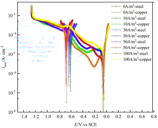 Potentiodynamic polarization curves for copper and steel electrodes with interference of AC intensities in simulated acidic soil solution.