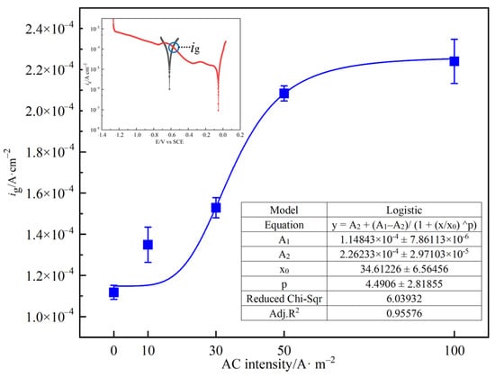 The potentiodynamic polarization result for copper and steel in the acidic soil simulated solution is shown in Figure 11. The analysis of potential and galvanic current is shown in Table 4. The galvanic current is also increased with the rise of AC interference intensities, which means the galvanic corrosion rate is enhanced. The galvanic corrosion rate is the highest at 100 A/m2; the fitted result of the galvanic current with AC is shown in Figure 12, ig representing the galvanic current. The adjusted R2 value of the fitted line is 0.956. It is also consistent with the logistic model which was brought into correspondence with the fitted model of weight loss and the potentiodynamic polarization results of the steel in the galvanic couple.