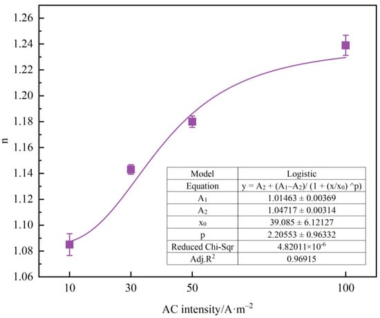 According to Formula (6), the first five terms (r = 4) are used to estimate the effect of AC induction. The anodic dissolution rate of galvanic couples is, respectively, 1.085, 1.143, 1.18 and 1.239 times larger than without AC interference of 10, 30, 50 and 100 A/m2. As Figure 13 shows, n represents the ratio of the anodic dissolution rate of the galvanic couple electrodes with and without AC interference. It shows a similar configuration to the curves of fitted corrosion current density for the steel–copper couples. The fitted equation also indicates that there is a logistic relationship between n and AC. The adjust R2 value of the fitted line is 0.976, which is also consistent with the fitted model of the above results.