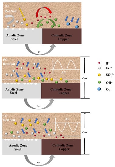 As is indicated in Figure 14a, the anodic dissolution of steel is accelerated when coupled with copper. As a current loop of the galvanic corrosion process, more Fe2+ escapes from steel, H+ migrates to the cathode area, while the negative ion, such as SO42− and OH−, migrate to the anode area. When AC is imposed on the galvanic electrode, as Figure 14b shows, the positive branch of AC increases the anode dissolution of electrochemical processes. H+ is pulled away from the electrode/electrolyte interface. The hydrolysis of Fe2+ is promoted, which causes more Fe2+ to dissolve to the electrolyte. Anode dissolution is further accelerated. During the negative branch of AC, as exhibited in Figure 14c, the reduction of oxygen is facilitated and enhanced. SO42− and OH− ions are pulled away from the electrode/electrolyte interface.