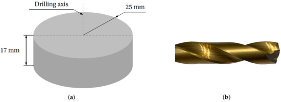 Experimental tests were carried out in order to identify the thermo-mechanical phenomena involved in dry drilling Inconel 718. Table 1 gives the chemical composition of the Inconel 718 superalloy. The experiments were performed on a 17 mm-thick cylindrical geometry with an external radius of 25 mm as shown in Figure 1a. The drill tool crosses the whole thickness of Inconel 718 with a rotation velocity and a feed per rotation equal to 910.7 rpm and 0.1 mm/rev, respectively. This geometrical configuration corresponds to standard industrial conditions. Each dry drilling test was conducted with a new tool that bored 3 holes with external lubrication as a break-in stage. The industrial reference of the drill tool is SECO SD203A-8.5-27-10R1-M (Seco Tools, Fagersta, Sweden) with a 8.5 mm diameter and a TiAlN–TiN coating as shown in Figure 1b.
