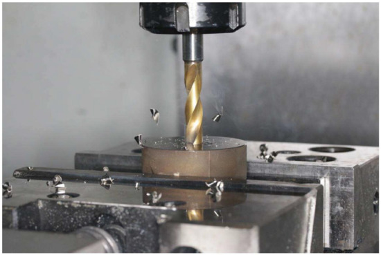 For a robust analysis of residual stresses, 3 dry drilling tests were carried out by means of an HAAS machining center (Haas Automation Inc., Oxnard, CA, USA) as illustrated in Figure 3. These tests were performed with thermocouples in order to obtain thermal kinetics very close to the hole surface. Thus, 3 K-type thermocouples were placed in locating holes with a diameter of 0.65 mm positioned near the hole surface as shown in Figure 4.