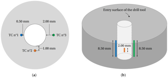 The curves of TC1 and TC3 show a thermal plateau phenomenon after the passage of the drill tip until approximately s. The temperature does not decrease to the initial ambient temperature, but seems to reach a higher asymptotic value. Consequently, the hole surface is maintained at a high temperature, as illustrated in Figure 9a. This evolution is due to the thermal interaction between the hole surface, the tool and hot chips going up along the flutes. From a thermal point of view, this phenomenon reflects the pumping of heat by the bulk of the component which is colder than the thermal environment in the drilled hole. We can, however, note that the thermal plateau phenomenon is not visible with TC2 located at 2 mm from the exit bottom face of the drill tool. Indeed, the end of the drilling operation follows very quickly the passage of the drill tip in this zone. Thus, TC2 only records a single temperature rise during drilling.